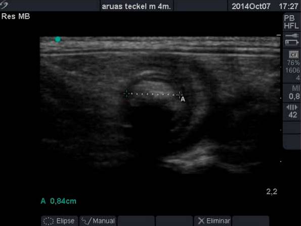 - Asa Yeyunal cráneo medial a riñón derecho (con paciente en decúbito lateral), con presencia de contenido hipoecogénico que produce sombra acústica limpia, dicha imagen es compatible con posible cuerpo extraño ecovisible de 0,84 cm de diámetro (además asa interior distendida con aumento de contenido de patrón líquido). Además se observa la presencia de múltiples capas intestinales que es compatible con posible invaginación o pseudoinvaginación intestinal, que hace que la imagen previamente descrita además de compatible con posible cuerpo extraño lo sea también con introducción de grasa abdominal.