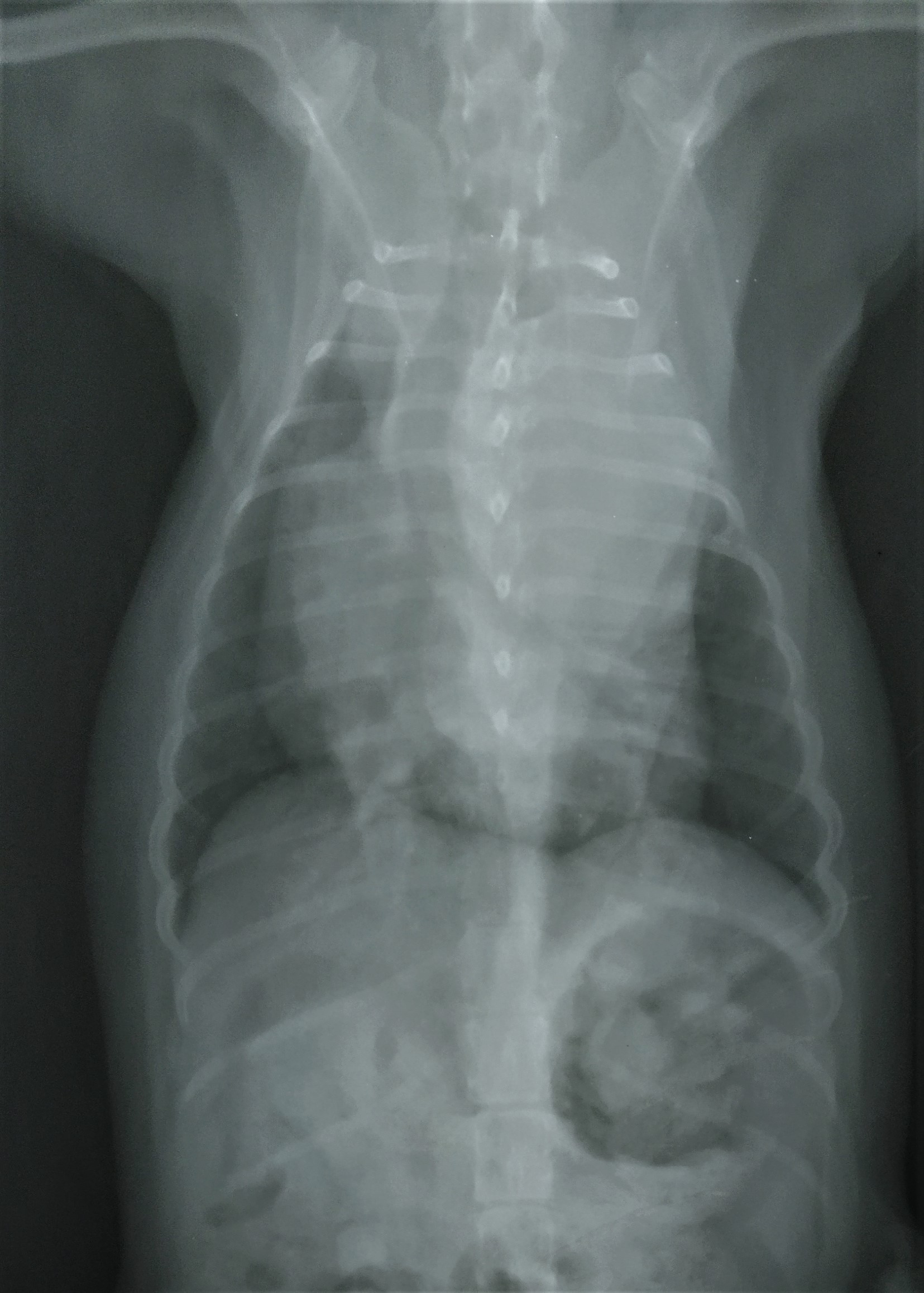 Acude a su veterinario hace 72 horas por tos y apatía. No vacunada ni desparasitada recientemente. A la auscultación cardíaca su veterinario no detecta soplo. Se realiza estudio radiográfico del tórax.