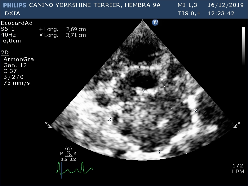 El propietario acude a DXIA para realizar el estudio comentando que ha mejorado con la furosemida. La paciente presenta condición corporal 2-3/6, está activa y respiración normal (FR normal). Mucosas sonsorosas, TRC menor de 2 segundos, pulso femoral normal.