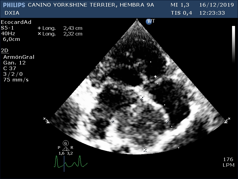 Corte apical izquierdo 4 cámaras. Se observa estructura hipoecogénica en zona del septo interauricular. No dilatación de ventrículos. No cambios en grosores de las paredes cardiacas. No presencia de derrame pericárdico.