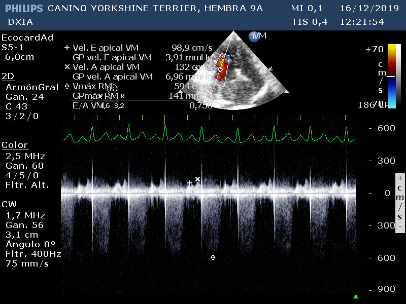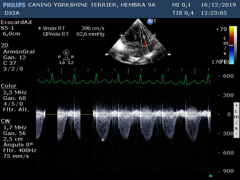 Corte apical izquierdo 4 cámras. Doppler tricúspideo. No se observan cambios en morfología de la VT. GP del flujo regurgitante de la VT mayor de 3 m/s, compatible con existencia de HP.