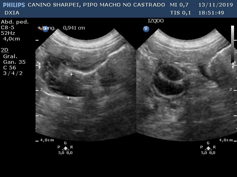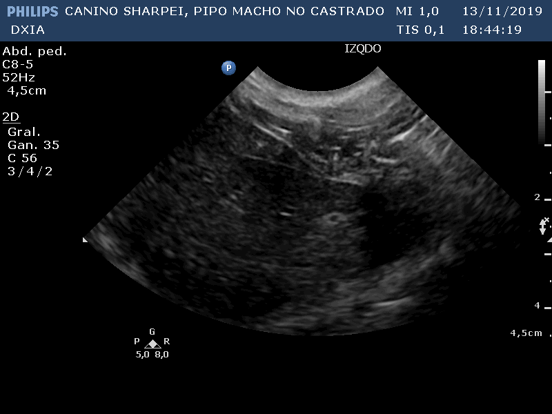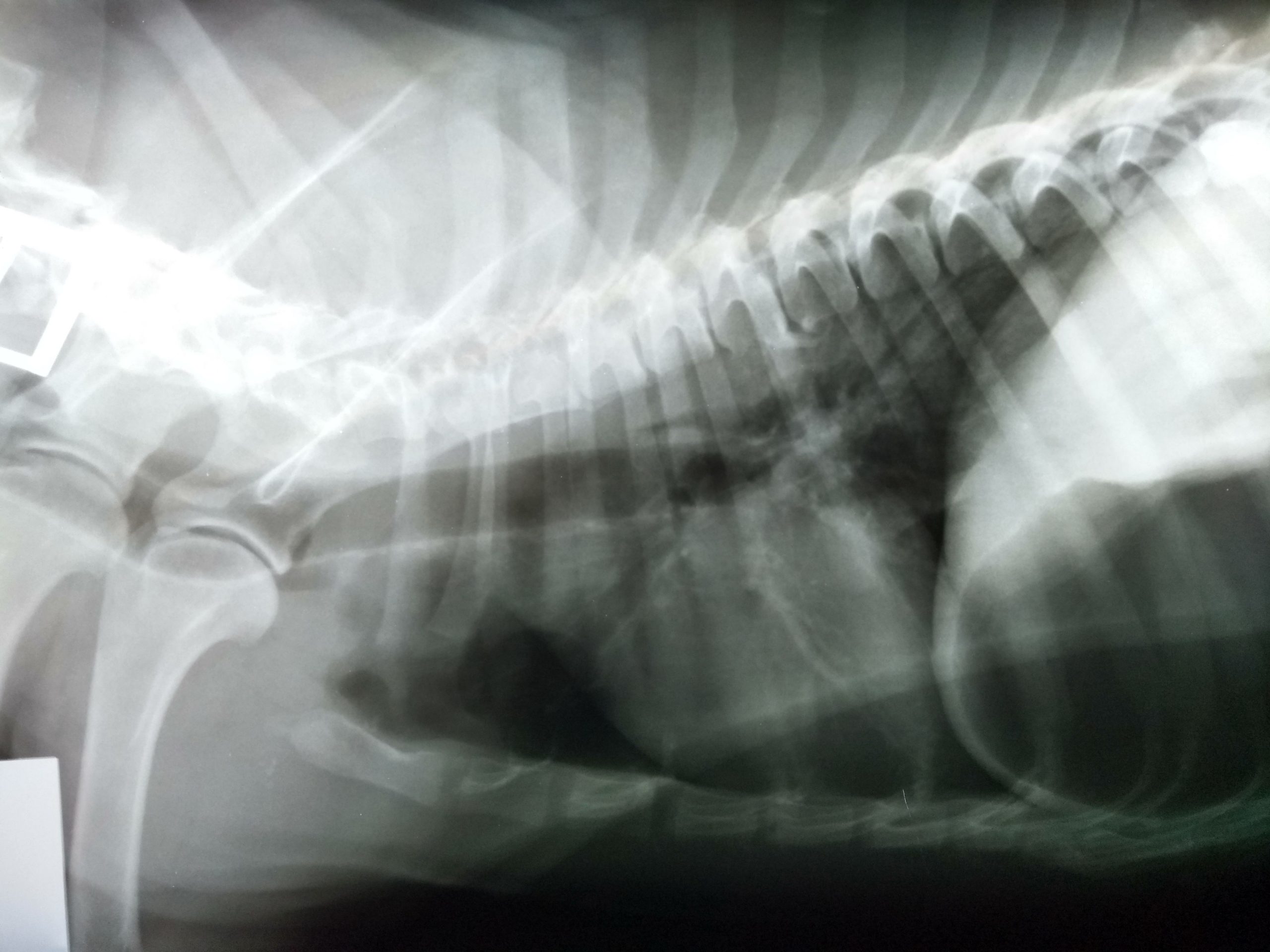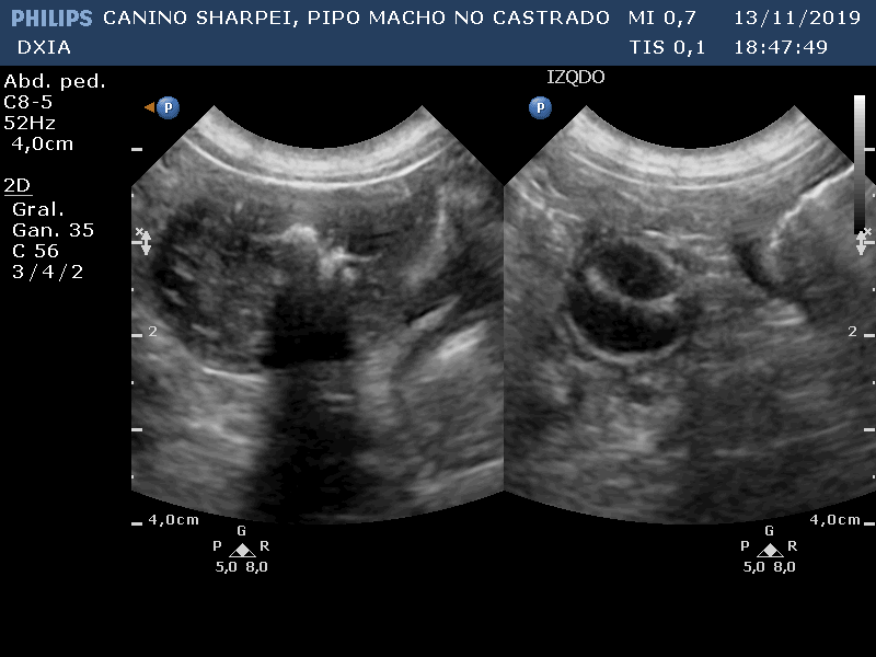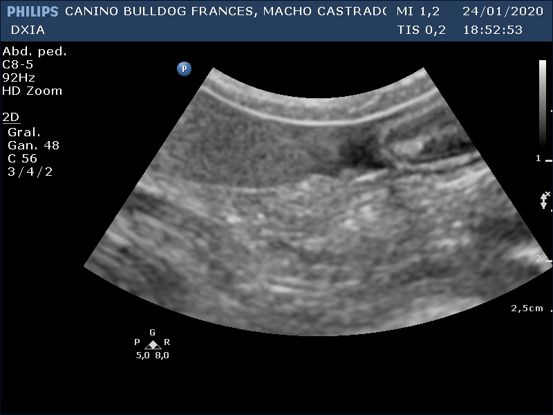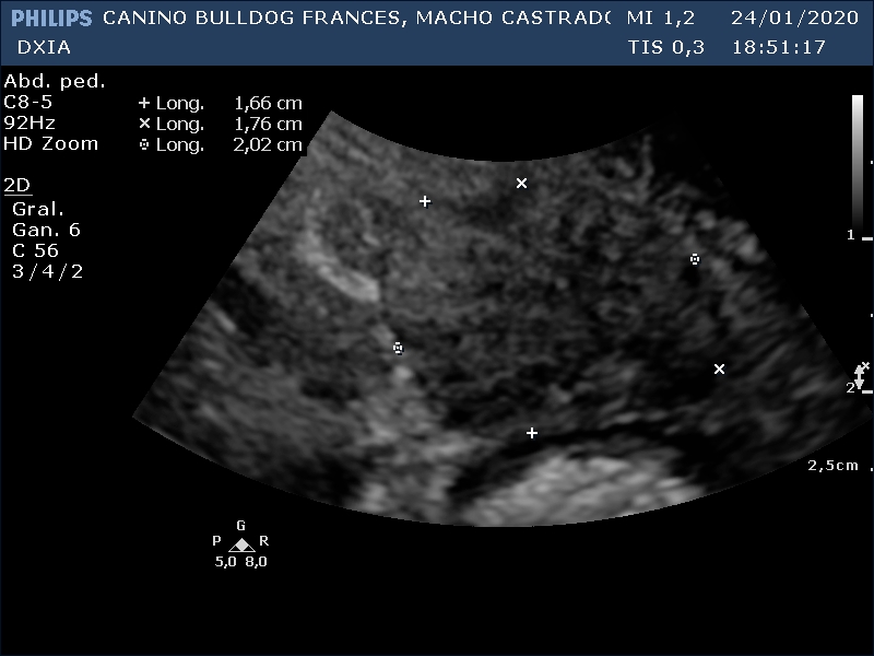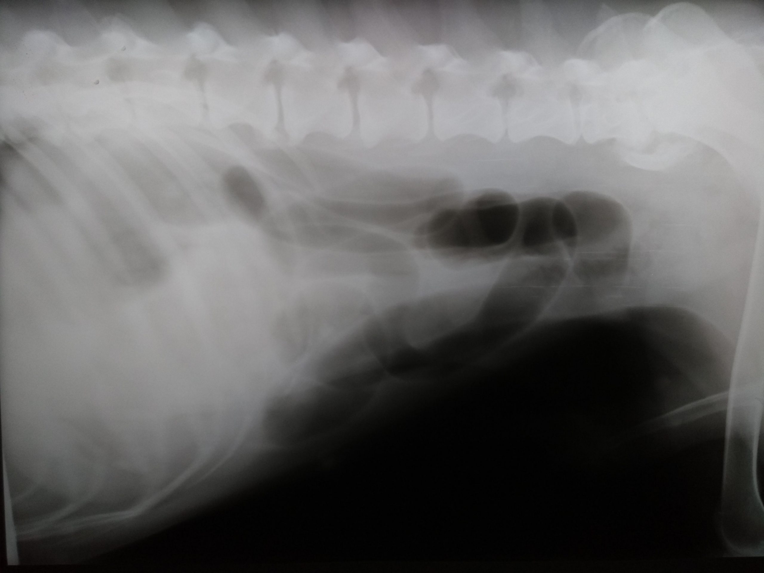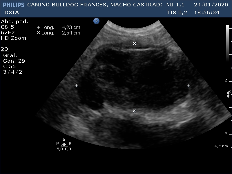 Se realiza estudio radiográfico de tórax y abdominal (no se incluyen todas las radiografías): El estudio no fue concluyente y el veterinario solicita estudio ecográfico abdominal a Dxia.