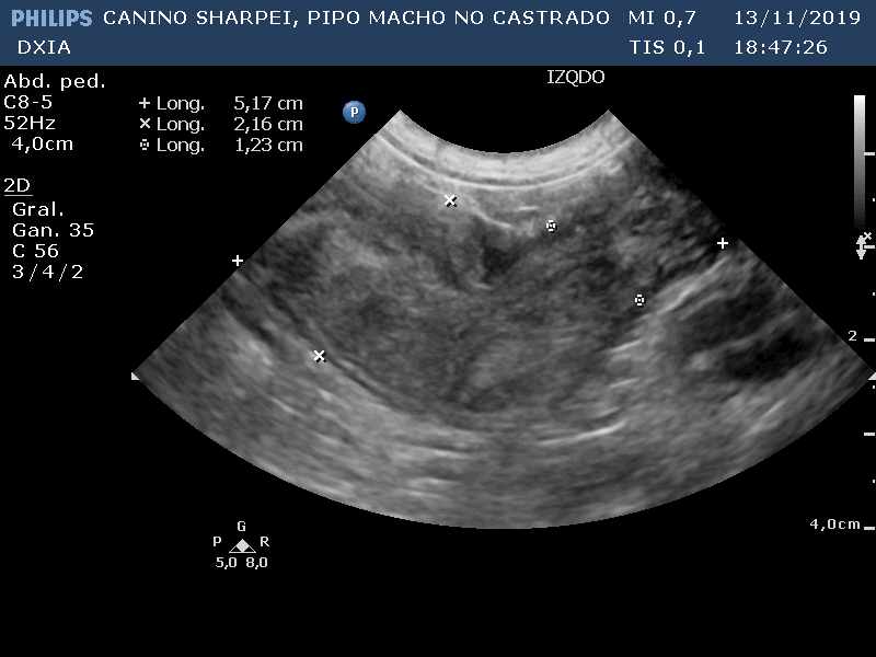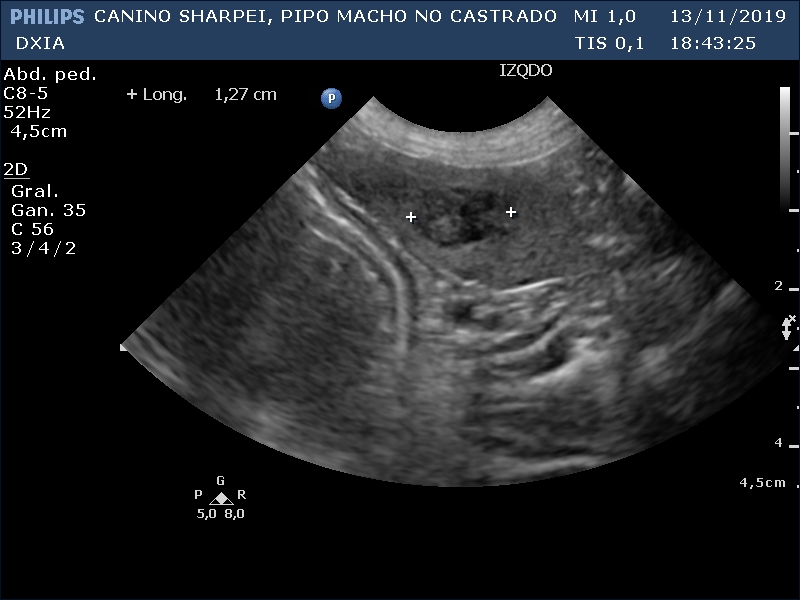 Próstata heterogénea, aumentada de tamaño y con bordes irregulares. Testículos normoecoicos durante el estudio.