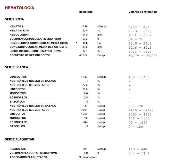 Analítica sanguínea (hemograma y bioquímica) no se observan alteraciones significativas salvo anemia ligera. Descartados parásitos hemáticos.