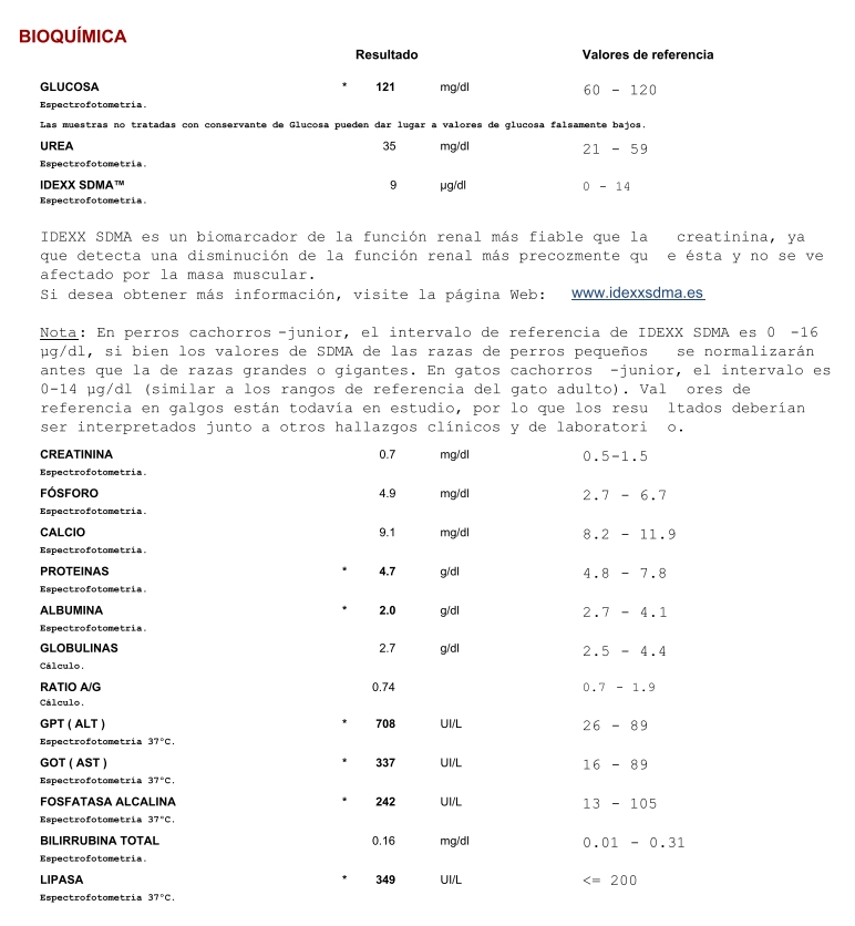 Analítica sanguínea (hemograma y bioquímica) con alteraciones no significativas. Descartados parásitos hemáticos.