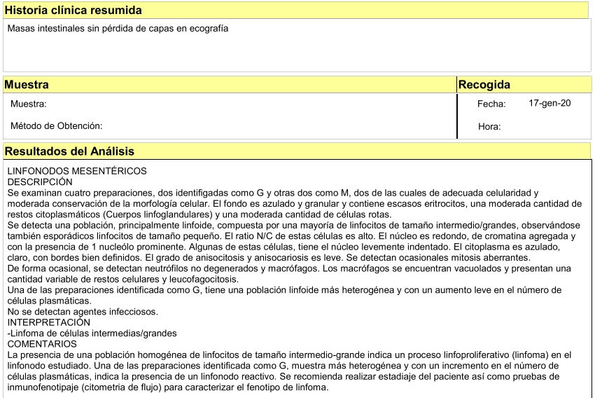 Se realiza ecografía y se observa alteración compatible con neoformación en asa del intestino delgado.