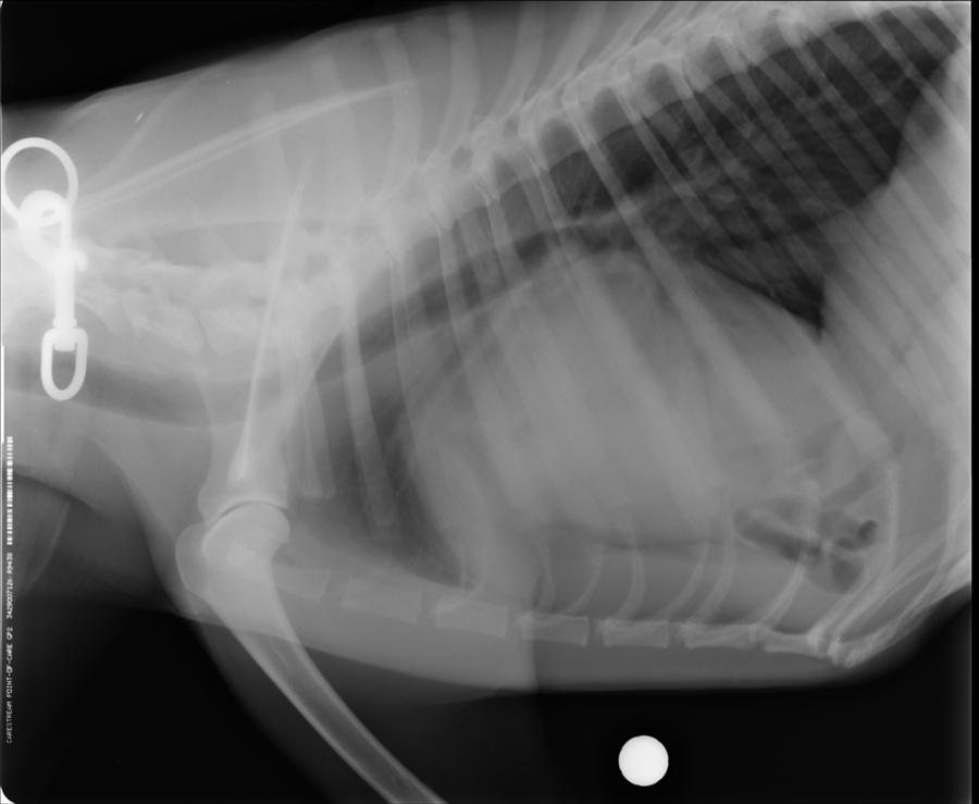 Su veterinario realiza estudio radiográfico de tórax y observa asas intestinales en tórax. No se observa claramente la silueta cardíaca. Por ello, se solicita a Dxia que lleve a cabo un estudio ecocardiográfico y una ecografía torácica no cardiaca.