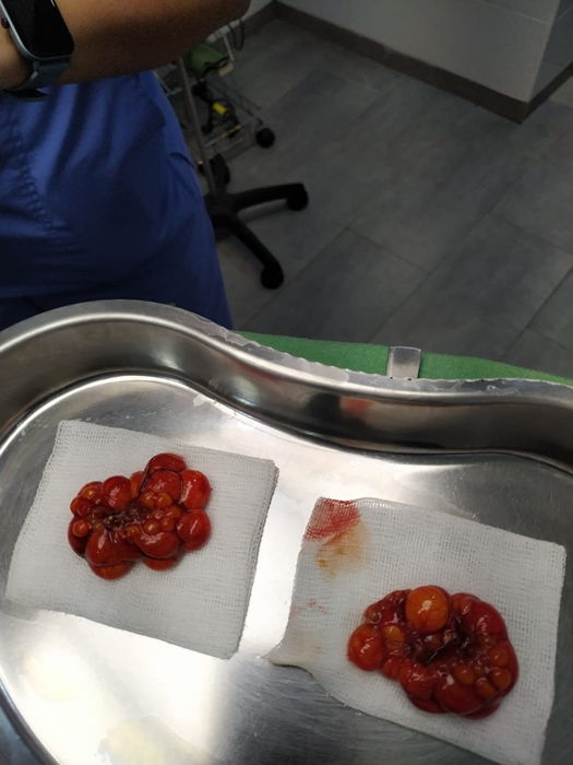 Su veterinario realiza la intervención quirúrgica y tras su extirpación, la imagen macroscópica confirma lo observado ecográficamente.